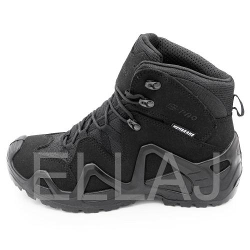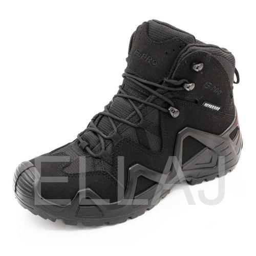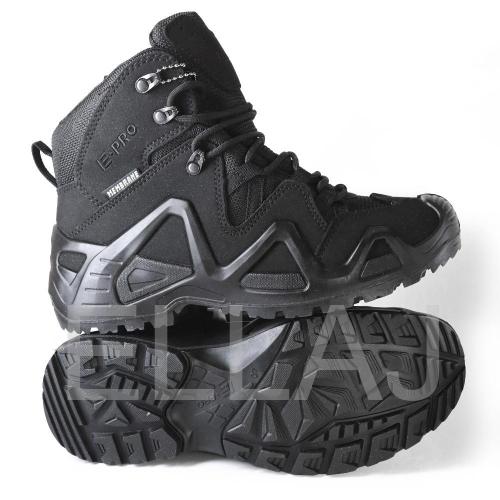 Серия обуви E-PRO — это одна из самых популярных в туристической и тактической обуви, используемая походниками, альпинистами, спортсменами, военными и сотрудниками правоохранительных органов. Линейка E-PRO Special представлена целым семейством моделей, отличающихся по цвету, высотой берца, а также наличием мембраны. Основной материал изготовления — высококачественная замша со вставками из кордуры. Наличие подкладки из мембраны делает обувь непромокаемой и одновременно дышащей, способной отводить испарения с поверхности стопы. Подлитой носок обеспечивает защиту от повреждений. Защитный рант с выборками для облегчения веса проходит по всему периметру и создает узнаваемый образ. Кроме основных функций, рант дает дополнительное сцепление с поверхностью, например, при движении вдоль склона. Высота среднего ботинка 14.5 см, этого хватает для отличной фиксации голеностопа. Все детали прошиты двойным швом, все швы сделаны крайне аккуратно. На пятке есть петелька, облегчающая надевание. Подошва имеет многослойную структуру. Промежуточный слой из полиуретана придает высокие амортизирующие свойства; ходовой слой из резины на основе натурального каучука делает подошву более износостойкой и способствует хорошему сцеплению с грунтом и другими плоскостями. Язычок с защитным клапаном исключает просачивание воды и попадание посторонних предметов внутрь.