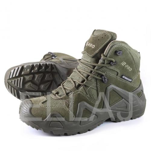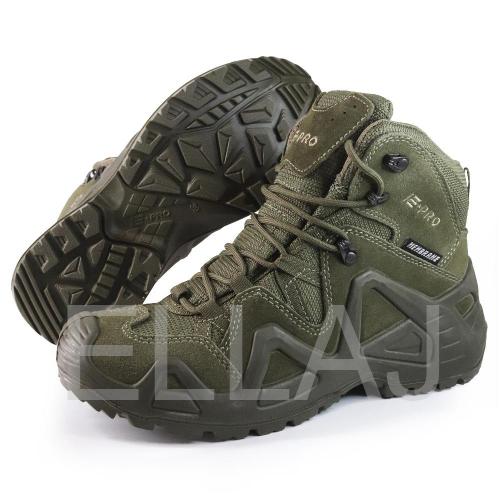 Серия обуви E-PRO — это одна из самых популярных в туристической и тактической обуви, используемая походниками, альпинистами, спортсменами, военными и сотрудниками правоохранительных органов. Линейка E-PRO Special представлена целым семейством моделей, отличающихся по цвету, высотой берца, а также наличием мембраны. Основной материал изготовления — высококачественная замша со вставками из кордуры. Наличие подкладки из мембраны делает обувь непромокаемой и одновременно дышащей, способной отводить испарения с поверхности стопы. Подлитой носок обеспечивает защиту от повреждений. Защитный рант с выборками для облегчения веса проходит по всему периметру и создает узнаваемый образ. Кроме основных функций, рант дает дополнительное сцепление с поверхностью, например, при движении вдоль склона. Высота среднего ботинка 14.5 см, этого хватает для отличной фиксации голеностопа. Все детали прошиты двойным швом, все швы сделаны крайне аккуратно. На пятке есть петелька, облегчающая надевание. Подошва имеет многослойную структуру. Промежуточный слой из полиуретана придает высокие амортизирующие свойства; ходовой слой из резины на основе натурального каучука делает подошву более износостойкой и способствует хорошему сцеплению с грунтом и другими плоскостями. Язычок с защитным клапаном исключает просачивание воды и попадание посторонних предметов внутрь.