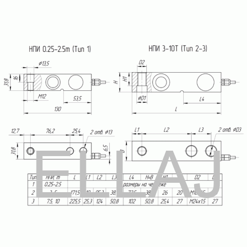 Наибольший предел измерения, т 0.25, 0.3, 0.5, 0.75, 1, 1.5, 2, 2.5, 3, 5, 7.5, 10 Рабочий диапазон температур, °С -30..+70