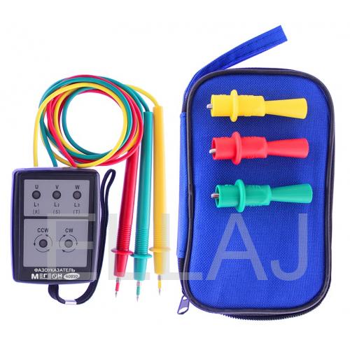 Порядок чередования фаз или полное отсутствие фазы отображается с помощью светодиодов на фронтальной панели прибора и встроенного зуммера. Комплект поставки включает в себя измерительные щупы типа "крокодил", которые существенное упрощают работу с фазоуказателем Мегеон 40850.