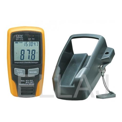 DT-172 Регистратор температуры и влажности может использоваться для мониторинга влажности и температуры в теплицах, складах, кабинах самолетов, изотермических автомобилях, контейнерах, музеях и оборудование для вентиляции и кондиционирования воздуха. Прибор производит измерения и сохраняет до 16350 значений относительной влажности и 16350 значений температуры в диапазоне от 0 до 100 % RH и от -40 до +70 °C. LCD дисплей может отображать максимальное и минимальное значения, текущие значения, знак тревоги.