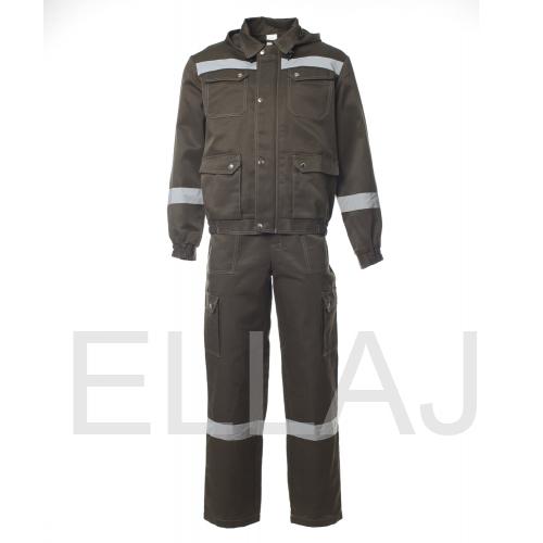 Костюм "АНТЕЙ" изготовлен в соответствии с ГОСТ и включает 2 предмета: куртка/полукомбинезон. Костюм с контрастной отстрочкой. На изделии расположены верхние накладные карманы с фигурными клапанами и перекантом на кнопках, нижние карманы с полуобъемом, с фигурными клапанами и перекантом на кнопках. Модель куртки представлена в укороченном варианте на поясе с частичной стяжкой на эластичной резинке. Куртка оснащена съемным капюшоном на пуговицах с регулировкой объема по лицевой части. На полукомбинезоне расположены многофункциональными карманы для хранения мелочей Эластичная резинка по талии спинки фиксирует посадку. Гульфик застегивается на молнию и застежку в правом боковом шве. Для безопасной работников в костюме "АНТЕЙ" предусмотрена световозвращающая полоса шириной 50 мм.
