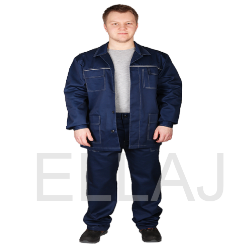 Состоит из куртки и брюк. Куртка прямая, с застежкой на пуговицы, с двумя нижними и нагрудным накладными карманами. На груди и спине светоотражающий кант. Брюки с передними накладными карманами.