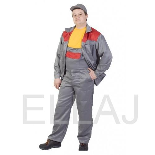 Состоит из куртки и полукомбинезона. Куртка прямая, с застежкой на пуговицы, с двумя нижними и одним верхним накладными карманами. Кокетка куртки выполнена из контрастной ткани. Рукава с защитными накладками в области локтей. Полукомбинезон с передними карманами и защитными накладками в области колен.