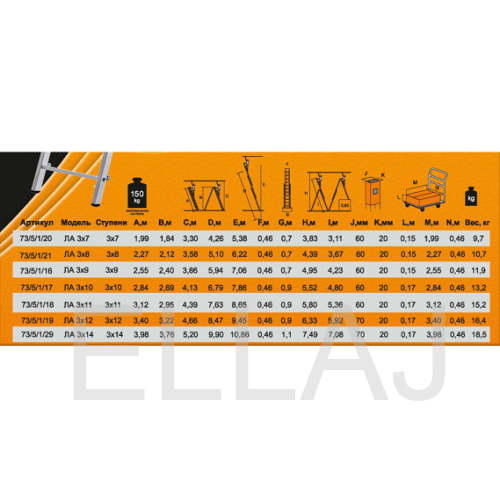 Корпус с антикоррозийным покрытием, изготовлен из алюминия. Благодаря пластиковым наконечникам ножек лестница не скользит по поверхности. Модель компактная, удобно хранить благодаря механизму трансформации. Поперечная траверса надежно фиксирует лестницу на поверхности.
