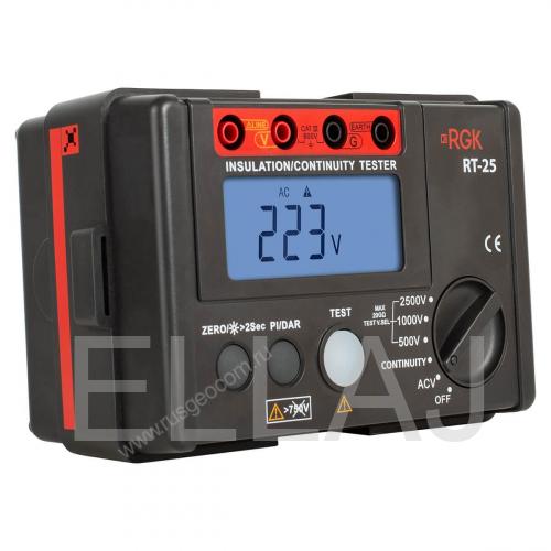 Мегаомметр RGK RT-25 776523 предназначен для оценки качества изоляции. Используется в процессе диагностики и ремонта электрооборудования, элементов энергосистем, трансформаторов, электродвигателей.