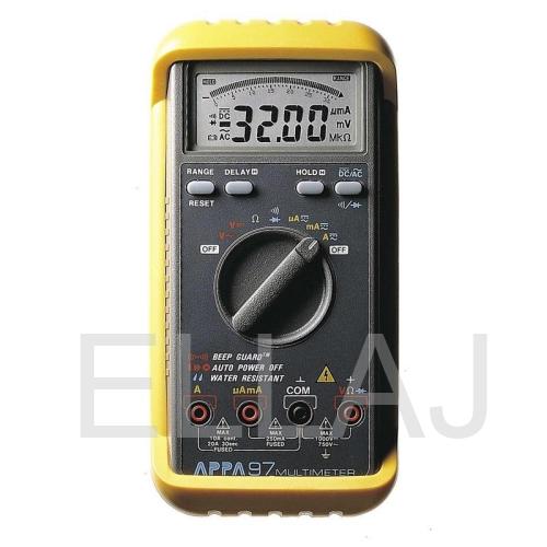 В отличие от младших моделей своей серии APPA 97 оснащен функцией автоматического выбора диапазона измерений, благодаря чему сокращено до минимума время подготовки прибора к работе. Цветовая маркировка гнезд щупов и поворотного переключателя делает процесс подготовки к измерениям более наглядным. Если выбор режима измерения произведен неправильно, прибор подает звуковой сигнал - функция BeepGuard.
