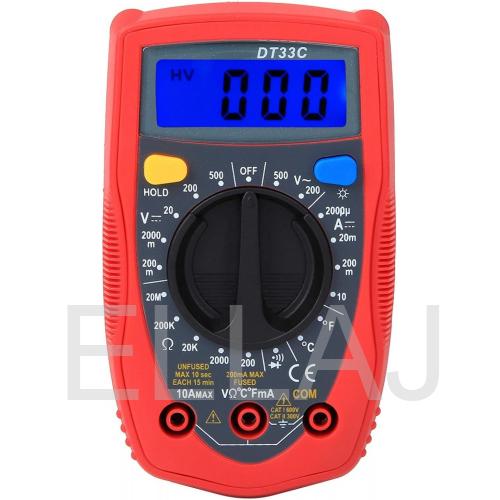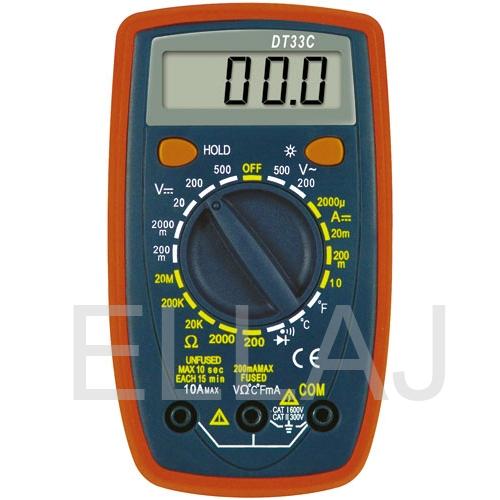 Портативный безопасный цифровой мультиметр DT33C с ЖК дисплеем, имеющий разрешение 3 ½ разряда, который предназначен для измерения постоянного и переменного напряжения, постоянного и переменного тока, сопротивления, температуры, тестирования транзисторов, а также прозвона цепи на обрыв