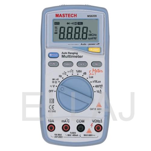 Профессиональный мультиметр MS8209 с автовыбором диапазонов. Революционный по своим возможностям цифровой мультиметр объединяет в себе сразу пять измерительных приборов с отличными характеристиками. Помимо основных функций мультиметра (измерения величин силы постоянного и переменного тока, постоянного и переменного напряжения, сопротивления), MS8209 позволяет измерять температуру, влажность, уровень звукового поля и уровень внешней освещенности. С помощью цифрового мультиметра MS8229 можно тестировать полупроводниковые диоды и прозванивать электрические цепи.