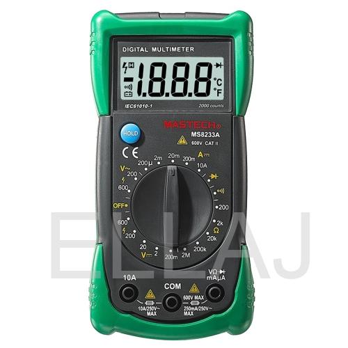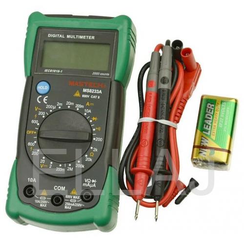 Универсальный мультиметр MS8233A измеряет постоянное и переменное напряжение, а также постоянный ток и сопротивление в цепи. С помощью него можно проводить тестирование диодов и осуществлять прозвонку целостности цепи.