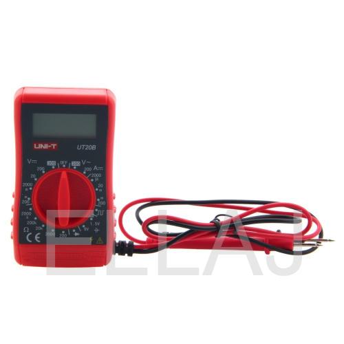 Портативный мультиметр UT20B подходит для измерения параметров напряжения, постоянного тока и сопротивления. Также с его помощью можно проводить тестирование батарей 1.5 В и 9 В, проверку диодов.