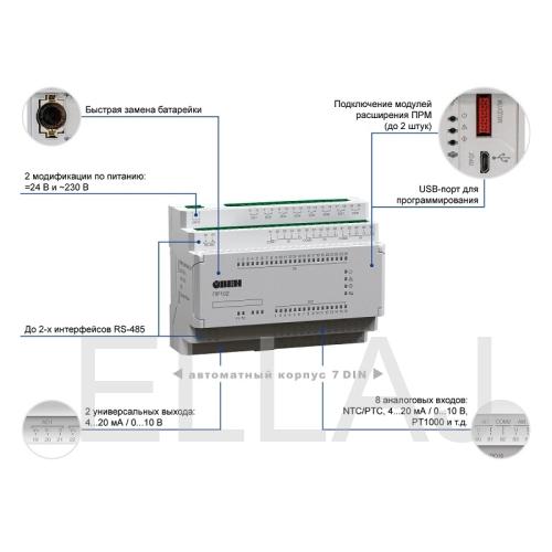 В корпусе 7DIN располагается 40 аналоговых и дискретных входов/выходов. Для расширения собственных входов/выходов предусмотрено подключение по внутренней шине модулей расширения ПРМ. В ПР102 может быть до 2-х интерфейсов RS-485 на борту: для управления устройствами по сети и передачи данных на верхний уровень. Написание алгоритма осуществляется пользователем на языке FBD с помощью бесплатной среды программирования OwenLogic. Загрузка алгоритма производится с помощью кабеля micro USB.