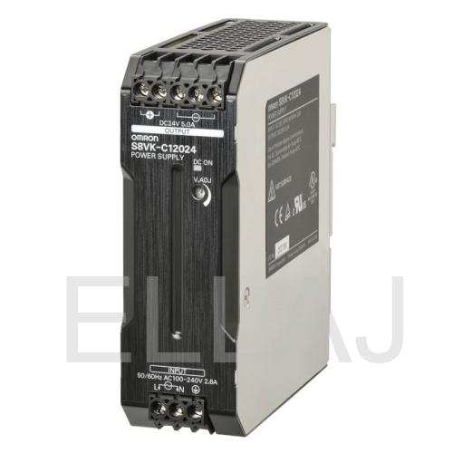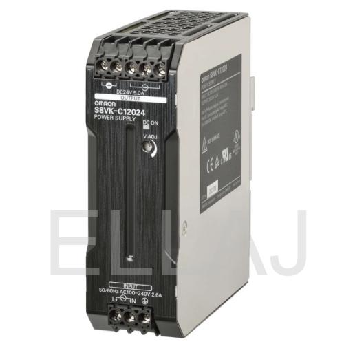 Импульсный источник питания серии s8vk-c, мощность 120 вт, входное напряжение 240 ~b, 350 =b, выходное напряжение 24 в, выходной ток 5 a, частота 50/60 гц (47..450 гц), защита от перегрузки, защита от повышенного напряжения/