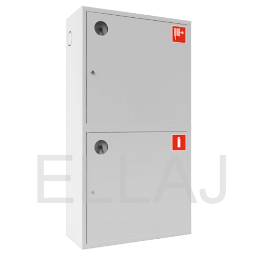 Состоит из двух вертикально ориентированных секций и служит местом хранения таких первичных средств пожаротушения, как огнетушители и комплекты пожарного крана (ПК). Изделие выполнено из листовой стали методом сварки и покрашено особой порошковой краской белого цвета. Для подведения противопожарного водопровода и монтажа на него пожарного крана (ПК) боковые стенки шкафа имеют перфорированные отверстия. Габариты секции для огнетушителей 700х650х300.