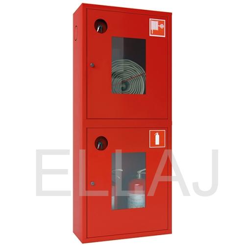 Используется для хранения первичных средств пожаротушения. В одном отсеке изделия размещается комплект пожарного крана, а в другом два огнетушителя (общей массой до 30 кг). Модель выполнена из листовой стали методом сварки и окрашена специальной порошковой краской красного цвета. Для подведения противопожарного водопровода и монтажа на него пожарного крана (ПК) боковые стенки шкафа имеют перфорированные отверстия. Габариты секции для огнетушителей 540х650х230.
