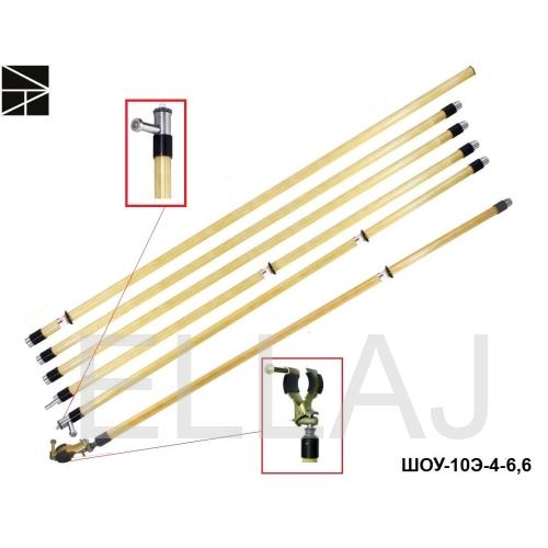 Штанга изолирующая универсальная ШОУ-10Э-4-6,6, сборная, многофункциональная, предназначена для оперативной работы с поверхности земли на воздушных линиях электропередач напряжением до 10 кВ, при комплектовании указателями напряжения для определения наличия или отсутсвия напряжения и наложения переносного линейного заземления до 10кВ типа КШЗ-10-1Ш, ЗПЛ-10-3, ЗПЛ-1-1Ш, ЗПЛ-10-1Ш, КШЗУ-0,4-10 с поверхности земли, так же, с помощью специальной дополнительной насадки, может работать совместно с пилой с электроизолирующей рукояткой марки ШО-ПЭР для спиливания сучьев и веток деревьев на высоте 6-7 м., вблизи ВЛ до 220 кВ без снятия напряжения, для замены трубчатых высоковольтных предохранителей в электроустановках напряжением до 330 кВ, а также в зависимости от количества используемых звеньев для оперативной работы на ВЛ и электроустановках постоянного и переменного тока 50 Гц и напряжением до 330 кВ. Болт-переходник М12, используется для присоединения Указателя напряжения и не рассчитан на дополнительные усиленные нагрузки. По требованию заказчика штанга поставляется с переходником под резьбу М 14.