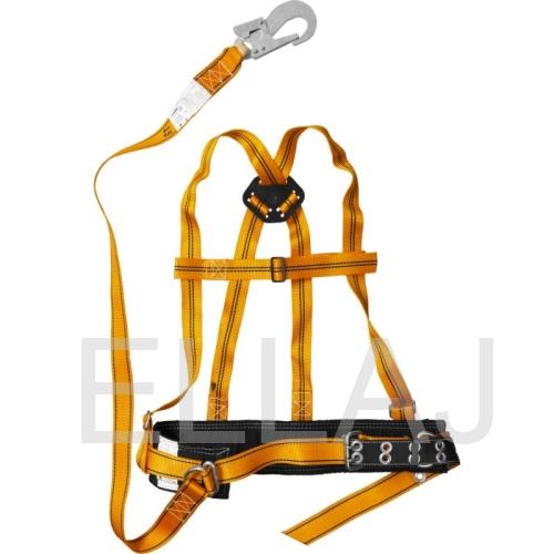 Пояс ПП со стропом из полиамидной ленты, наплечными лямками (нагрузка на разрыв составляет 2т.,ширина 36мм., длина фала включая карабин 1440 (1700)мм. Фал имеет регулировочное устройство.(планка фала) выполненное из листового метала t-5 предназначенного для изменения длины фала в зависимости от условий работ).