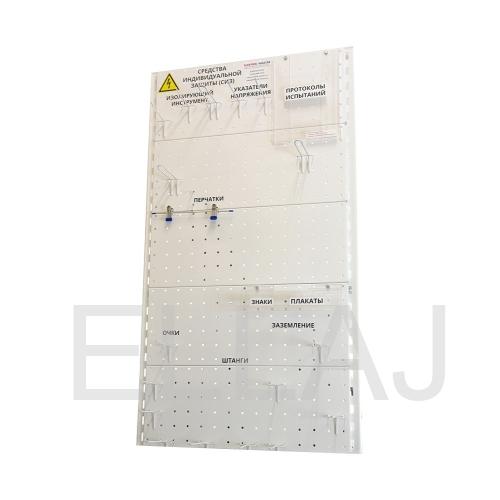 Стенд ELMA107 для хранения СИЗ настенный металлический предназначен для создания условий хранения средств индивидуальной защиты, применяемых в электроустановках, в соответствии с требованиями инструкции СО 153-34.03.603-2003 по применению и испытанию.