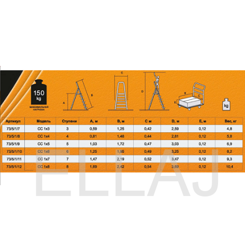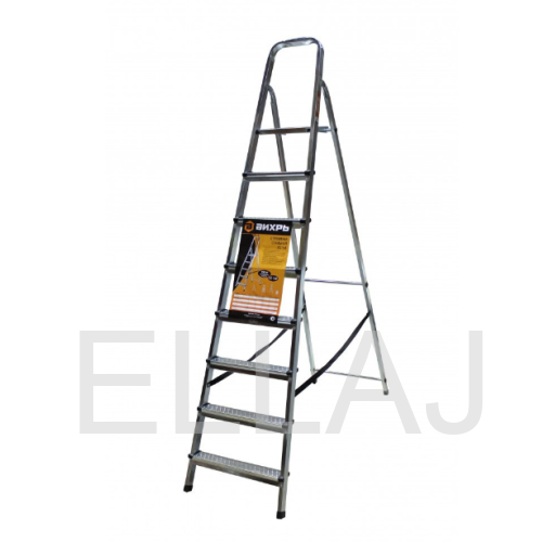 Прочный корпус изготовлен из стали. Покрыта гальваническим антикоррозийным покрытием. Односекционная модель с 7-ю широкими ступенями с рифленой поверхностью и рабочей площадкой. Чтобы стремянка не скользила, на опорах оборудованы заглушки. Также есть дуга безопасности. В сложенном состоянии модель очень компактна и занимает мало места.