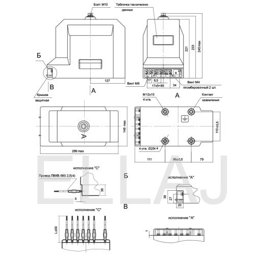 | Предельная мощность трансформатора вне класса точности | 400 или 630 ВА |