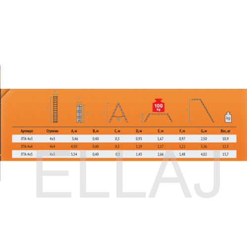 Среди особенностей модели можно выделить ступени с рифлением для безопасного подъема и спуска, стойки и ступени из прессованного алюминиевого профиля. Стойки с дополнительным усилием в наиболее нагруженных местах для повышения жесткости. Многократная развальцовка в соединении ступеней со стойками обеспечивает высокую прочность и долговечность. Шарнирные замки регулируются одной рукой. Широкие поперечные траверсы обеспечивают высокую устойчивость при работе во всех положениях. Башмаки траверсы препятствуют скольжению и надежно закреплены с помощью заклепок. Максимальная нагрузка в положении помост 100 кг.