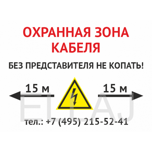 Знак «Охранная зона кабеля. Без представителей не копать», OZK-02 на 2-мм пластике, размером 400х300 мм устанавливается для обозначения зоны залегания кабеля в местах его пересечения с автомобильной дорогой и другими коммуникациями. Знак должен быть установлен на определенном расстоянии от земли – на высоте человеческого роста (1,7 м). На нем обязательно размещение таких данных, как адрес и телефон эксплуатирующего линию предприятия, размеры охранной зоны