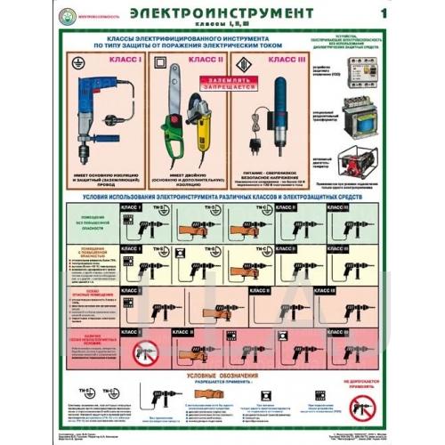 - 1 Плакат – Классы электрифицированного инструмента по типу защиты от поражения электрическим током, условия использования электроинструмента различных классов и электрозащитных средств