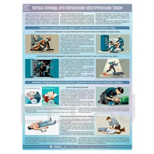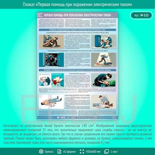 Плакат «Первая помощь при поражении электрическим током» (М-122) описывает порядок оказания первой доврачебной помощи при поражении электрическим током.