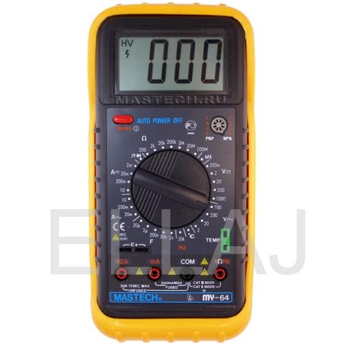 Цифровой мультиметр Mastech MY64 имеет богатый набор функций. С помощью него можно измерять величины силы постоянного и переменного тока, постоянного и переменного напряжения. сопротивления, коэффициента усиления биполярных транзисторов, емкость конденсаторов, температуру окружающей среды и частоту синусоидального сигнала в звуковом диапазоне. Высокое входное сопротивление не вносит погрешности при измерениях величин и говорит о высокой точности прибора. В приборе применен АЦП с измерением значений методом двойного интегрирования. Выбор пределов измерения величин производится вручную путем установки нужного положения многопозиционного переключателя.