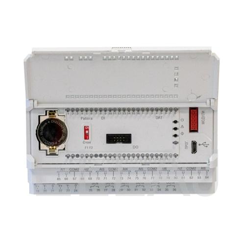 В корпусе 7DIN располагается 40 аналоговых и дискретных входов/выходов. Для расширения собственных входов/выходов предусмотрено подключение по внутренней шине модулей расширения ПРМ. В ПР102 может быть до 2-х интерфейсов RS-485 на борту: для управления устройствами по сети и передачи данных на верхний уровень. Написание алгоритма осуществляется пользователем на языке FBD с помощью бесплатной среды программирования OwenLogic. Загрузка алгоритма производится с помощью кабеля micro USB.