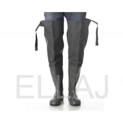 Сапоги ПВХ рыбацкие регулируются по длине на бретелях. Верхняя часть герметично соединена с сапогами. Модель изготавливается на базе рабочих сапог. Изделие полностью водонепроницаемо. Наколенники выполнены из винтитола и поролона. На заказ сапоги могут быть изготовлены с металлическим защитным носком (Мун 200) и проколозащитной металлической стелькой (1200 Н).